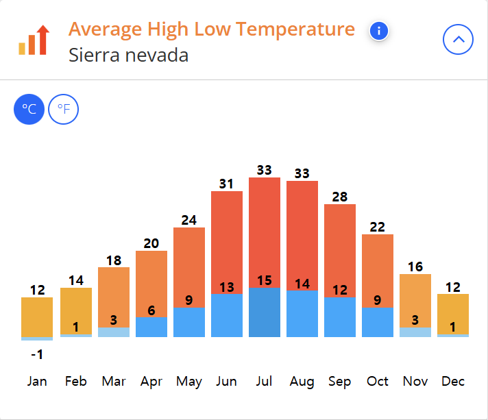 ↬ 여름 : 평균 기온 15℃에서 25℃로 강수량이 적으며, 시원하고 쾌적한 날씨로 하이킹 하기 좋은 시즌입니다.