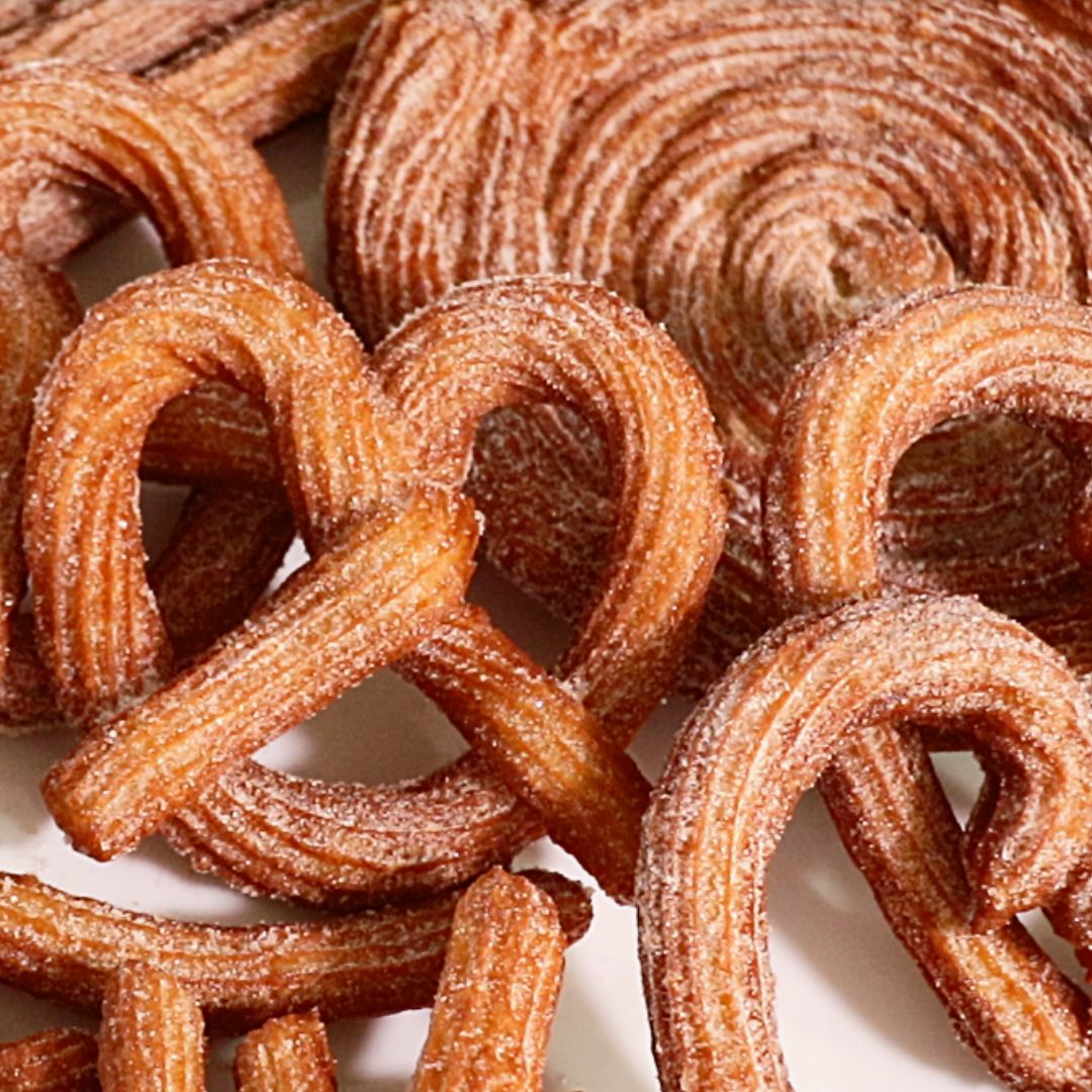 : 시나몬 맛이 나는 길쭉한 튀김 과자로 설탕을 뿌려 먹거나 초콜릿 소스에 찍어 먹습니다.