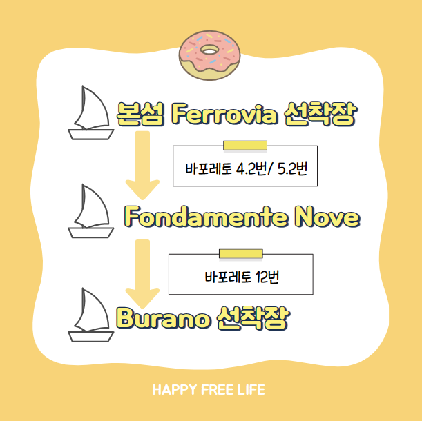 산타루치아 역 → (4.2번, 5.2번 바포레토) → Fondamente Nove 선착장 → (12번 바포레토) → 부라노 섬 → (12번 바포레토) → 무라노 섬 → (3번, 4.1번 바포레토) → 베네치아 본섬