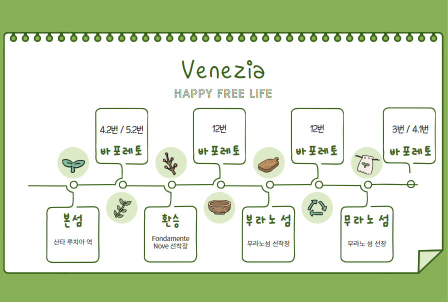 산타루치아 역 → (4.2번, 5.2번 바포레토) → Fondamente Nove 선착장 → (12번 바포레토) → 부라노 섬 → (12번 바포레토) → 무라노 섬 → (3번, 4.1번 바포레토) → 베네치아 본섬