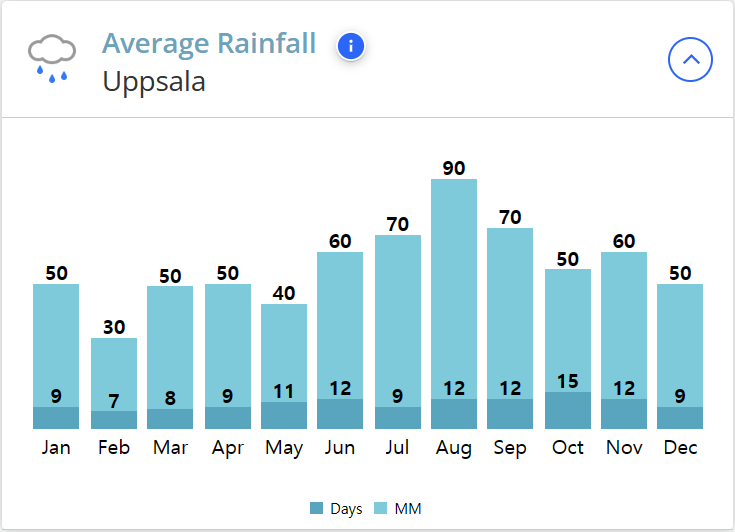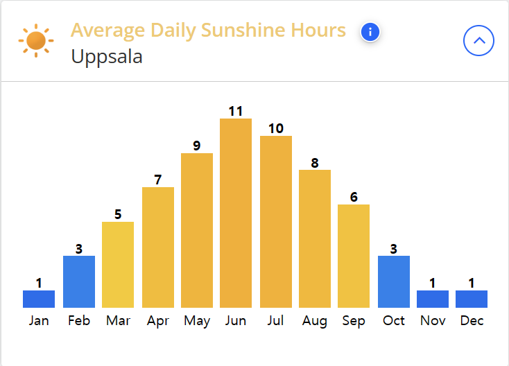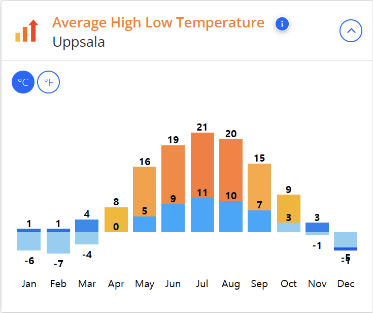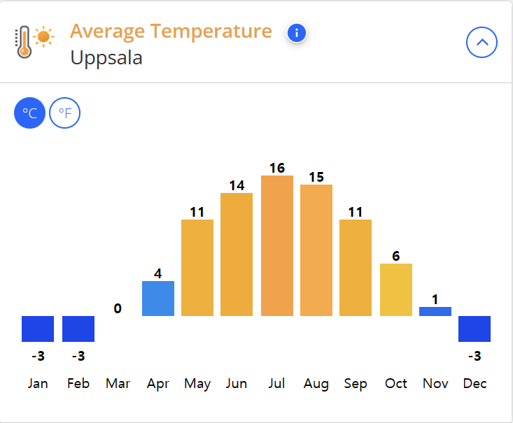 웁살라의 여름 평균 기온은 16℃로 한국의 여름보다 시원하며 겨울의 평균 기온은 -3℃ 입니다.