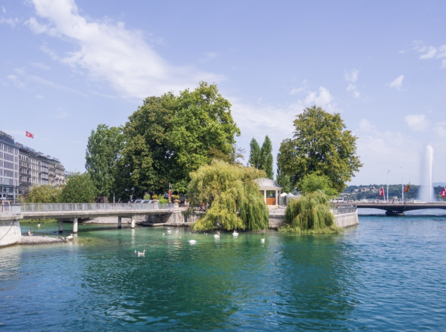 섬에는 제네바 중심에 위치한 잔디밭과 나무 그늘,
