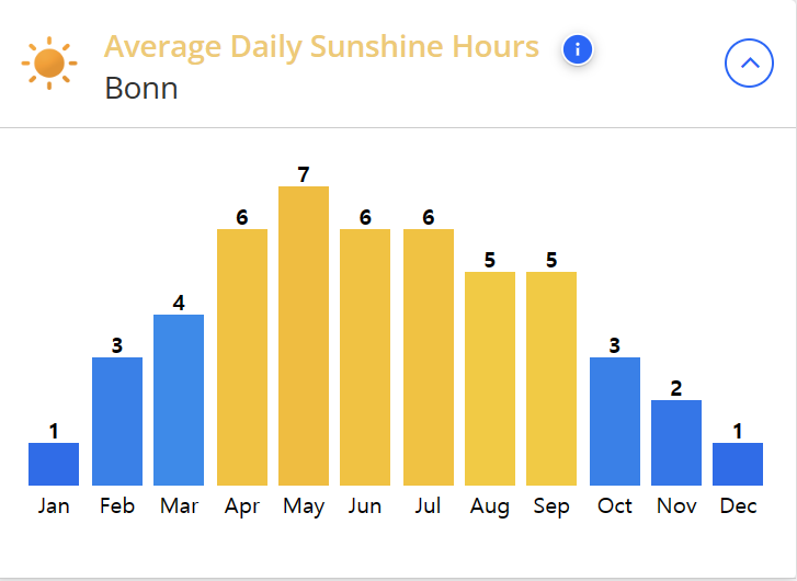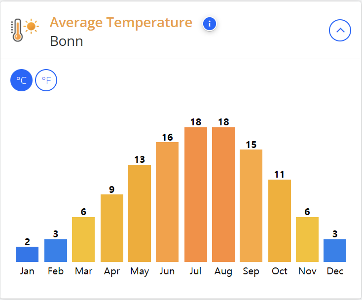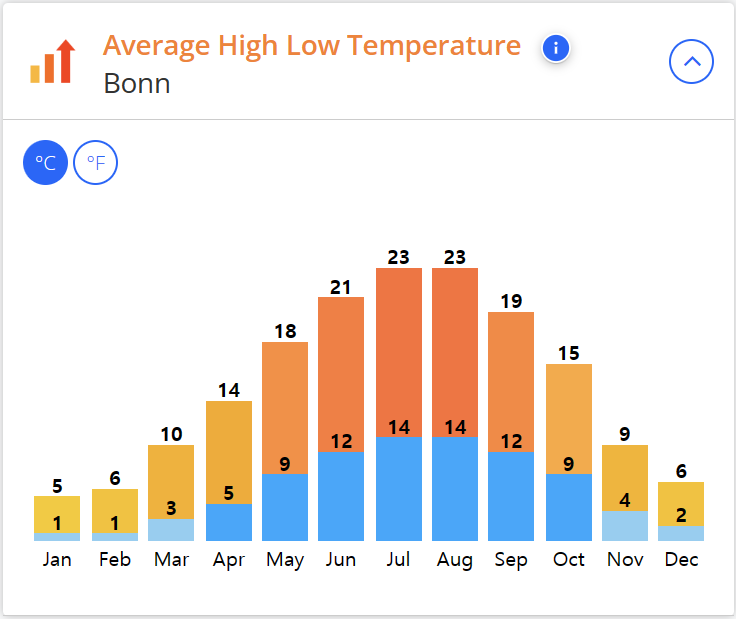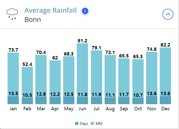 쾰른의 여름은 평균 18℃이며, 겨울은 2℃입니다. 가장 습한달은 6월로 평균 강수량은 91.2mm입니다.
