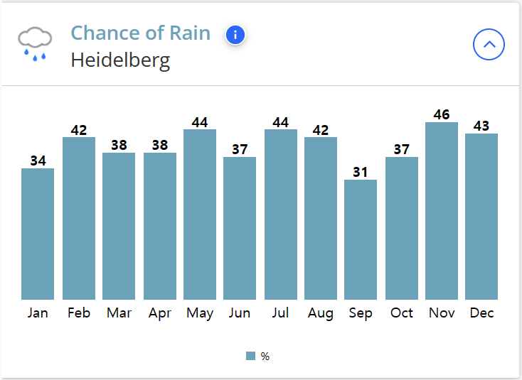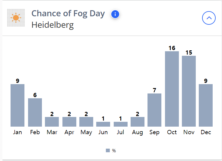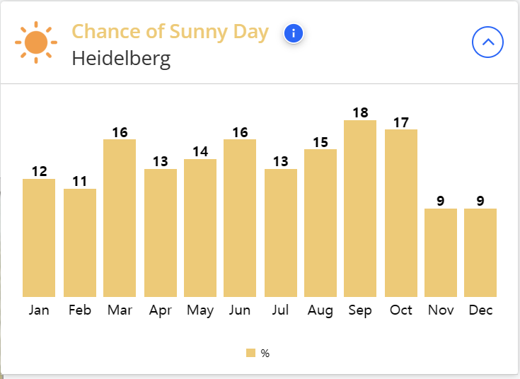 하이델베르크의 여름 날씨는 26℃이며, 겨울은 1℃로 한국의 겨울보다 따뜻합니다.