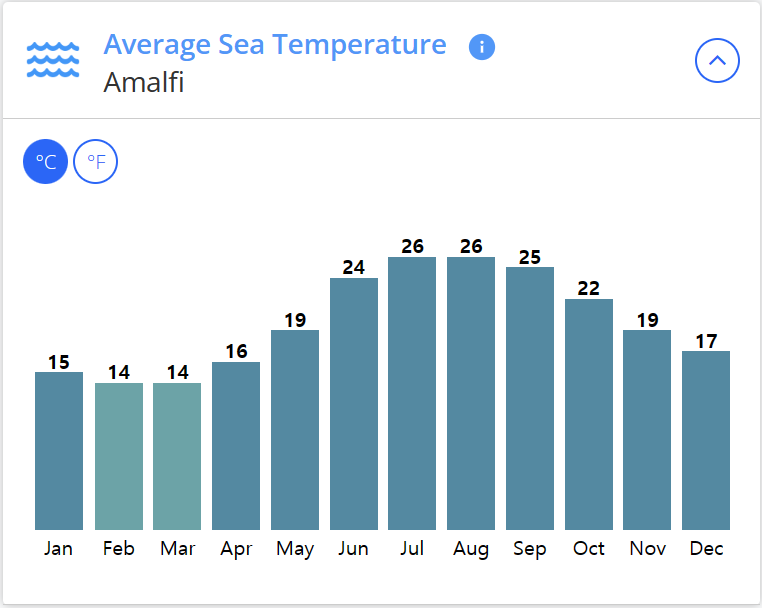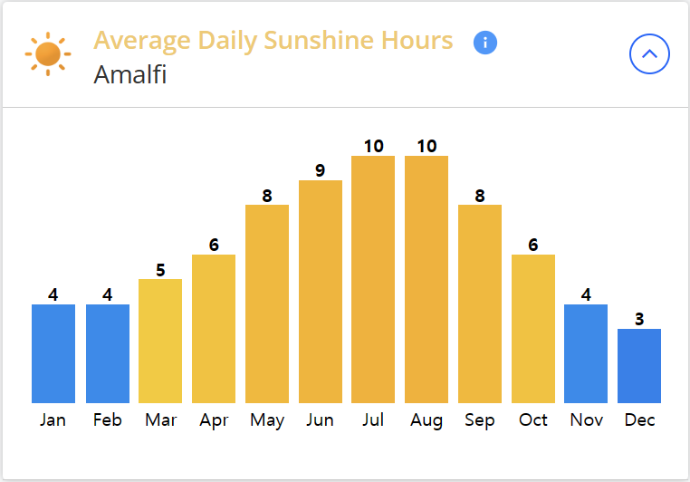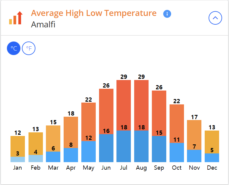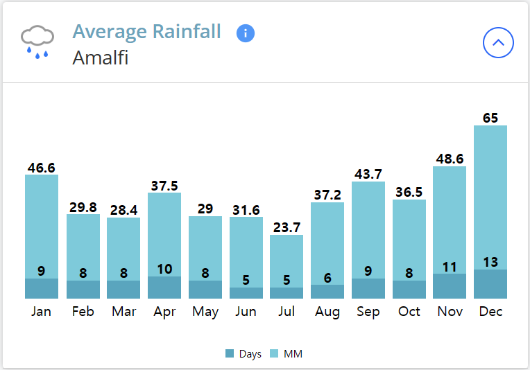 1년 내내 온화한 기온을 자랑하는 아말피는 여름철 해수 온도가 26℃까지 상승하며, 해수욕이 가능한 여름철이 성수기입니다. 해당 시즌에는 여행객이 매우 붐비기 때문에 4~5월 / 8월말~10월 초까지는 여유롭게 여행을 즐기실 수 있습니다.