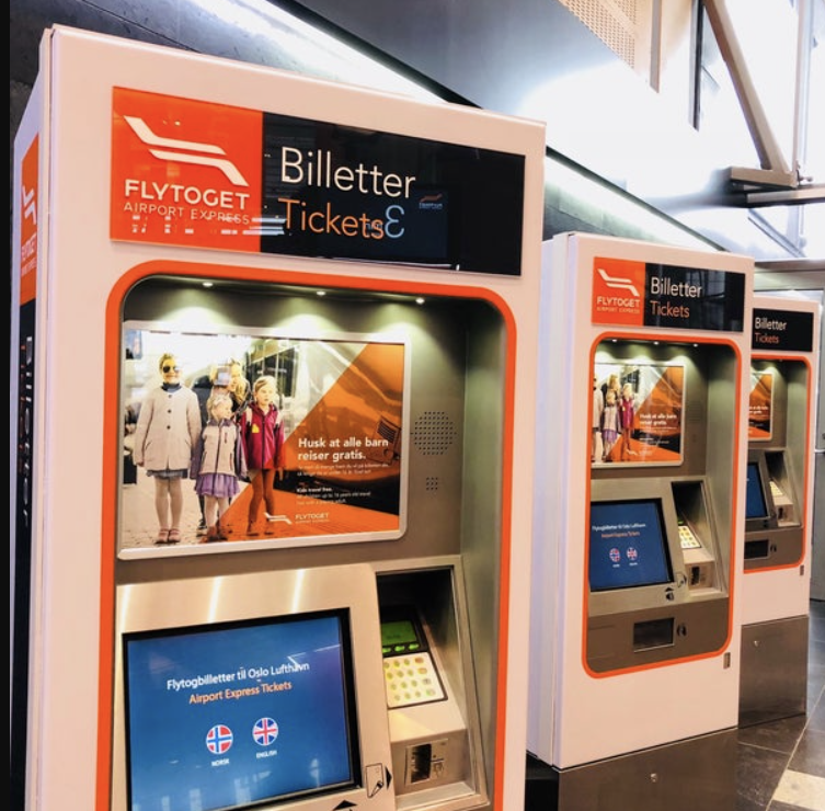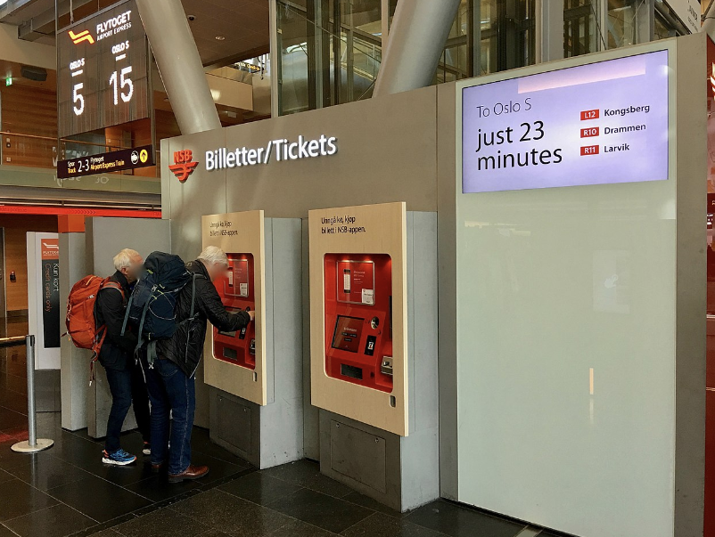 오슬로 중앙역, 국립극장까지 연결되는 쾌속 기차편으로, 공항 기차역 오랜지색 자동판매기를 통해 발권하실 수 있습니다.
