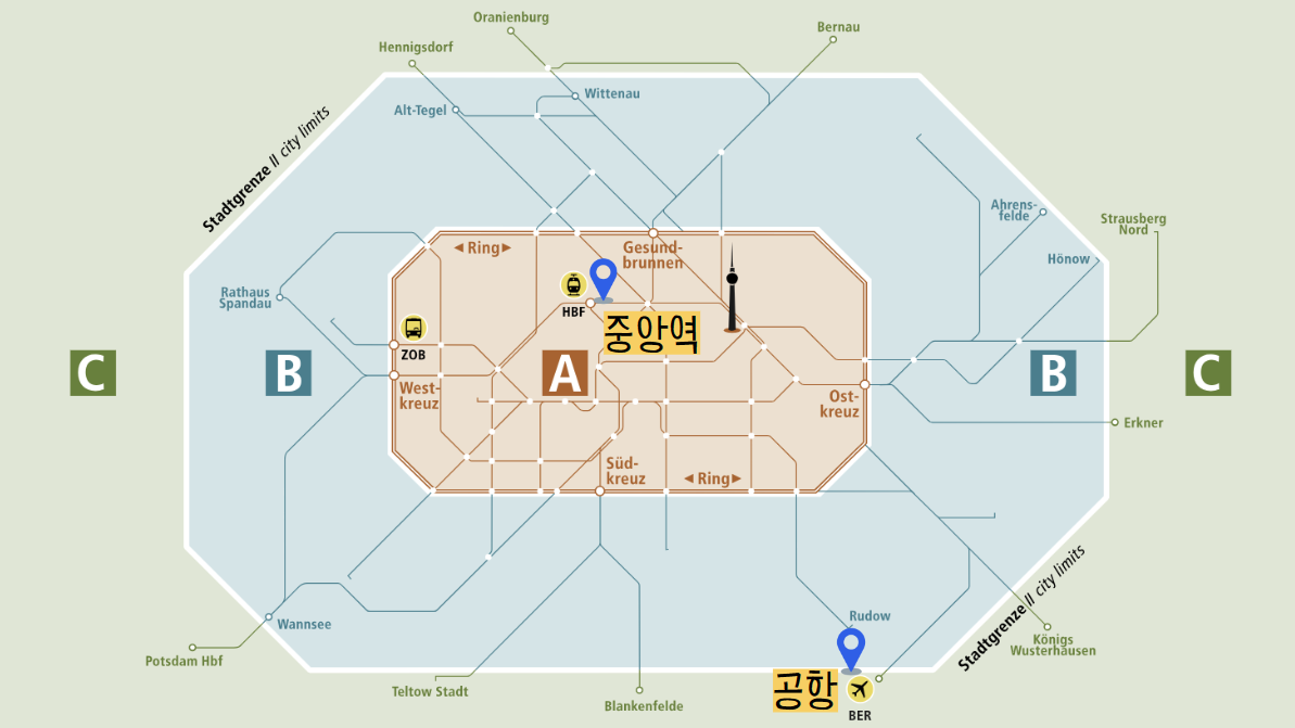 * VBB 티켓 구매 시, S-Bahn, U-Bahn, 지역열차, 트램, 페리, 버스 모두 이용 가능합니다.