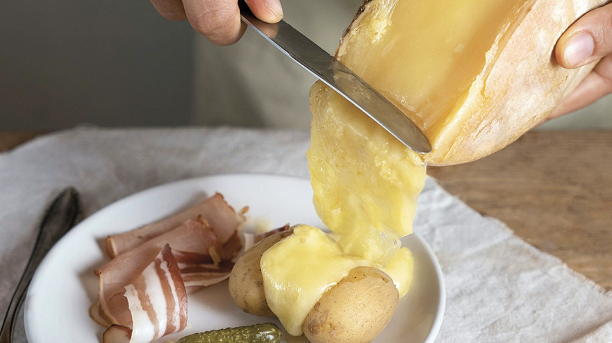 스위스 전통 치즈요리로 둥근 라클렛 치즈를 반으로 잘라