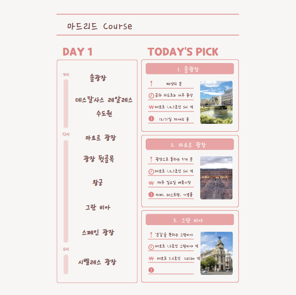 → 광장 뒷골목 → 왕궁 → 그란 비아 → 스페인 광장  → 시벨레스 광장