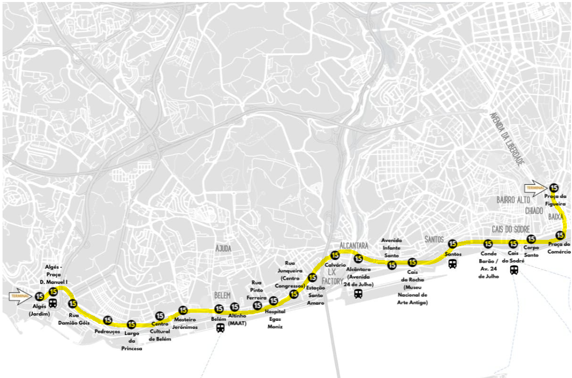 구시가 벨렝 지구를 연결하는 황금 노선으로, 해안가를 통과하는 노선입니다.