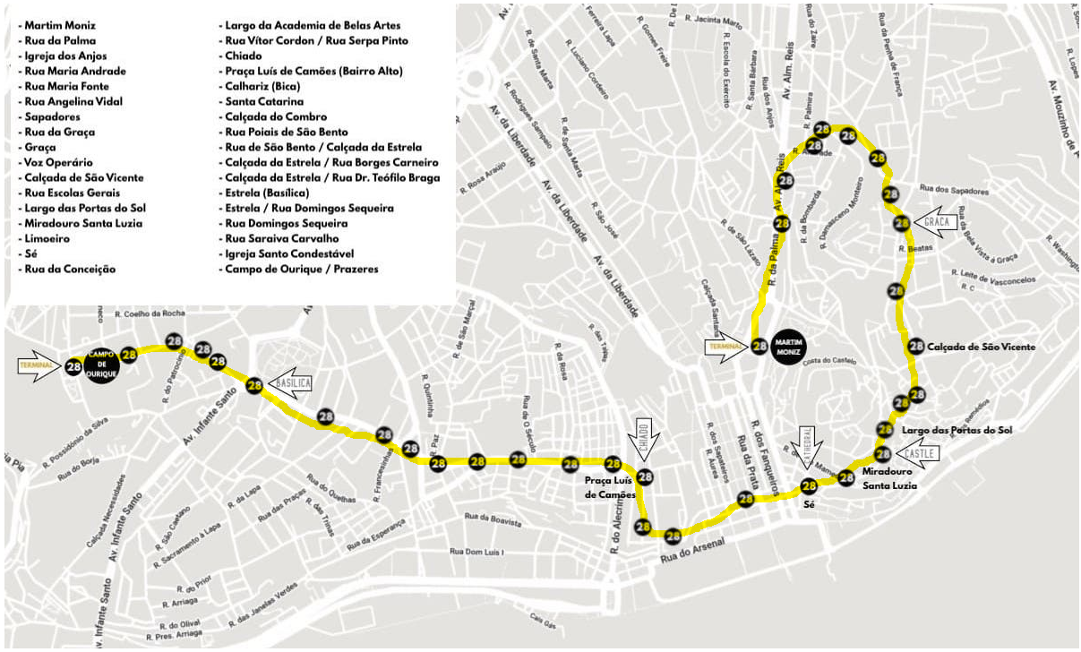카몽이스 광장, 아우구스타 거리, 대성당, 포르타스 두 솔 광장, 상 조르즈 성 등을 오가는 28번 트램을 타면 리스본의 아름다운 풍경과 뒷골목을 감상하실 수 있습니다.