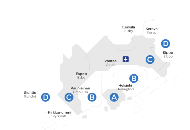Tickets for zones ABCD can be used on buses, commuter trains, trams, the metro and Suomenlinna ferry in the HSL area. Buy tickets on the HSL app or with HSL card.