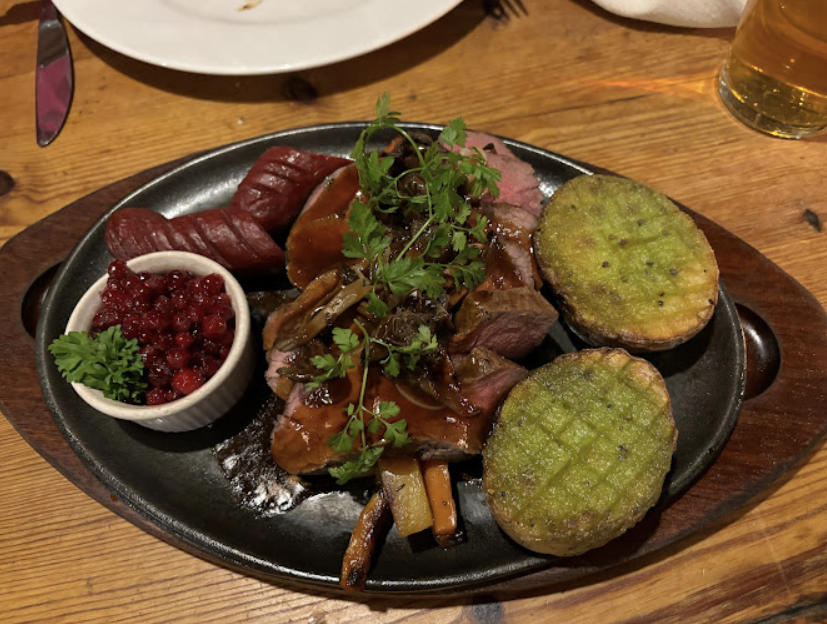 제철 농산물로 만든 음식을 제공하며 순록 스튜, 포테이토 퓌레, 송아지 고기, 크렌베리 치즈케이크, 바닐라 아이스크림 등