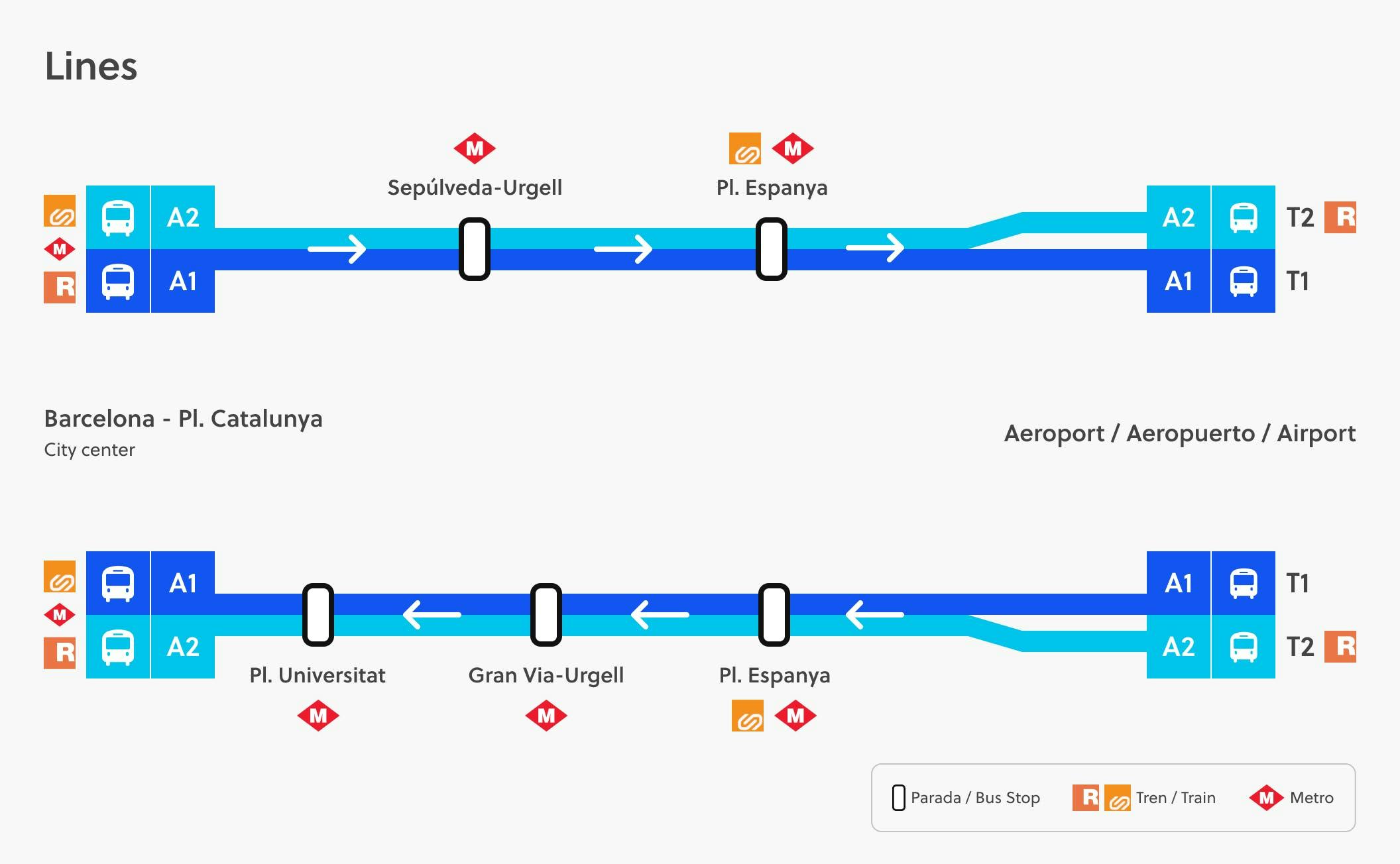 T1과 T2에서 4~10분 간격으로 운행되며, 카탈루냐 광장까지 35분 소요됩니다. 가격은 편도 5.9유로이며 24시간 운행합니다.