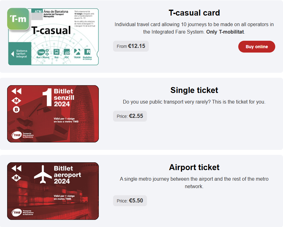 바르셀로나는 버스와 지하철, 트램, 푸니쿨라 등 대중교통이 잘 구성되어 있어, 대중교통으로 관광하기 편리한 도시입니다. 티켓은 역내 매표소나 자동판매기에서 쉽게 구매 가능하며, 1회권, 10회권, 1일권, 2~5일권, 한달권 으로 구매 가능합니다.