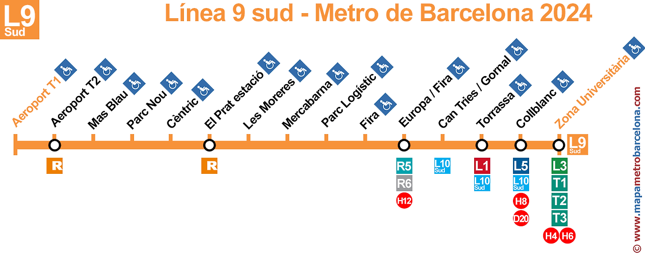 오랜지색 L9 라인은 바르셀로나 City Center에서 공항까지 연결되며, 오전 5시부터 새벽 2시까지 7분 간격으로 운행됩니다. 가격은 5.15유로이며 32분 소요됩니다.