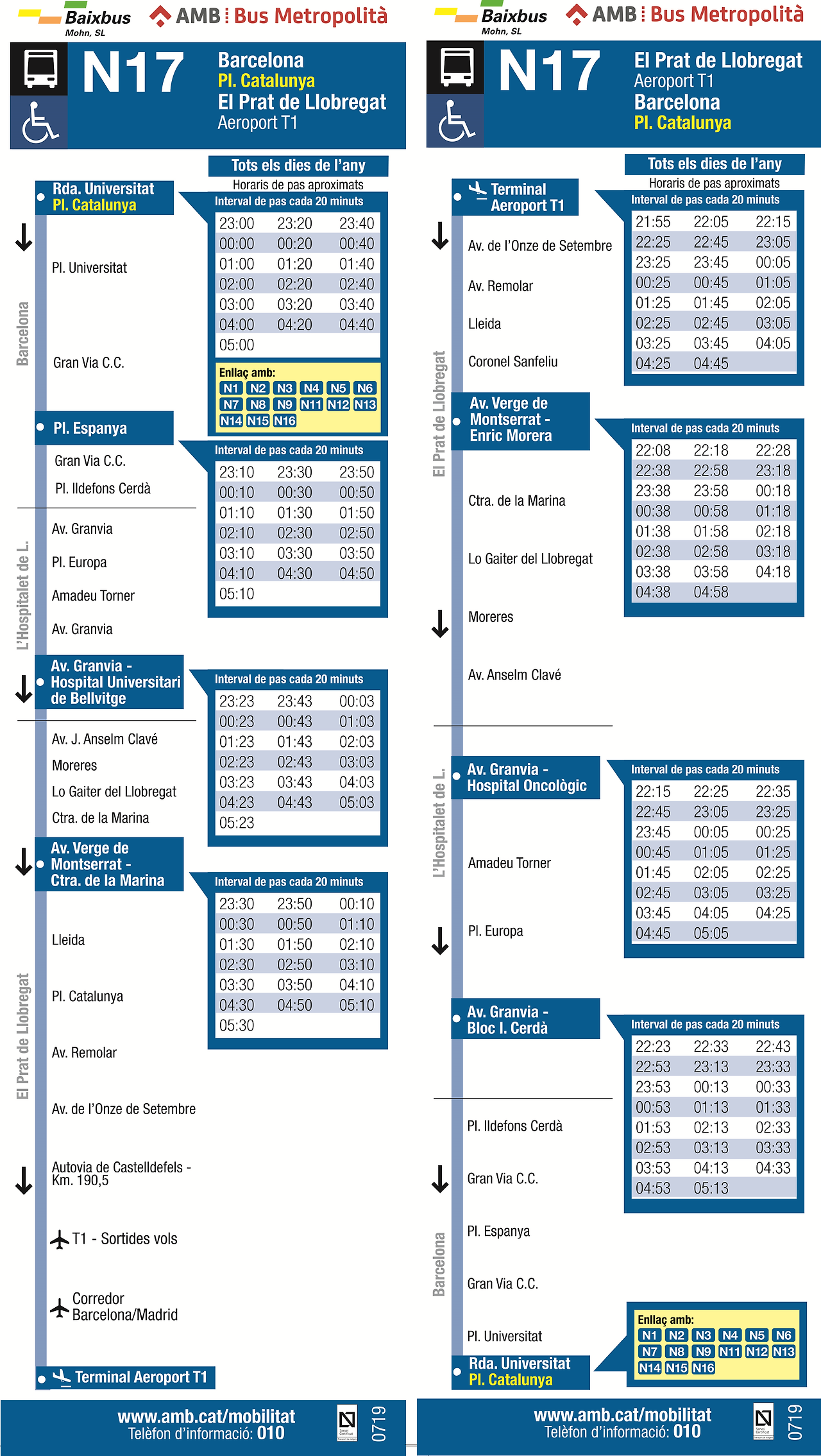 N17 : Terminal1 버스 정류장에서 탑승가능하며, 오후 10시부터 새벽 5시까지 운행되됩니다. 요금은 2.4유로입니다.