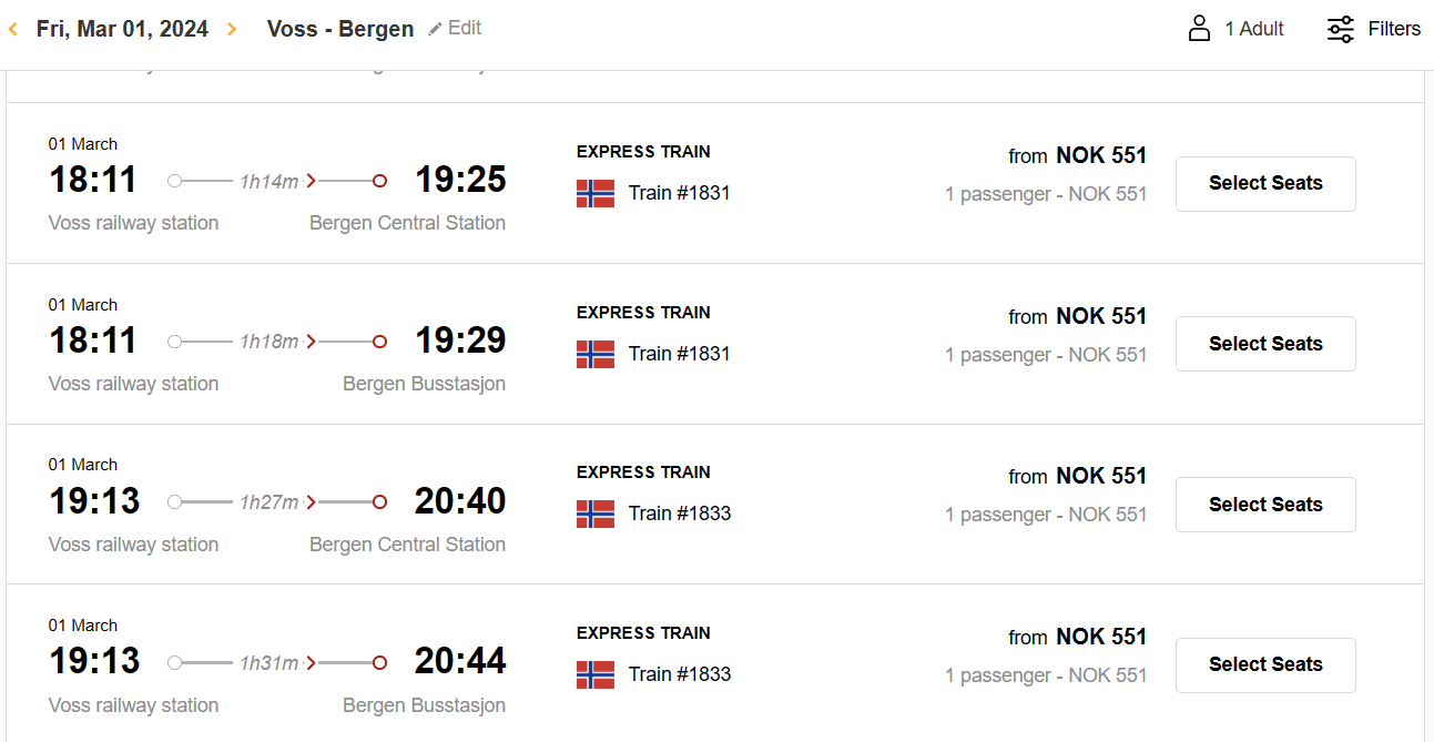 • tip! 저같은 경우는 버스가 지연되며 늦게 도착하는 경우가 있다고 하여 보스 - 베르겐 구간은 당일 버스에서 도착 시간을 예상한 후, 어플을 사용해 예약했습니다! (늦은 시간 탑승하는 기차라 자리는 널널하며 기차역에서 기차표를 구매해도 상관 없을 것 같더라구요.)