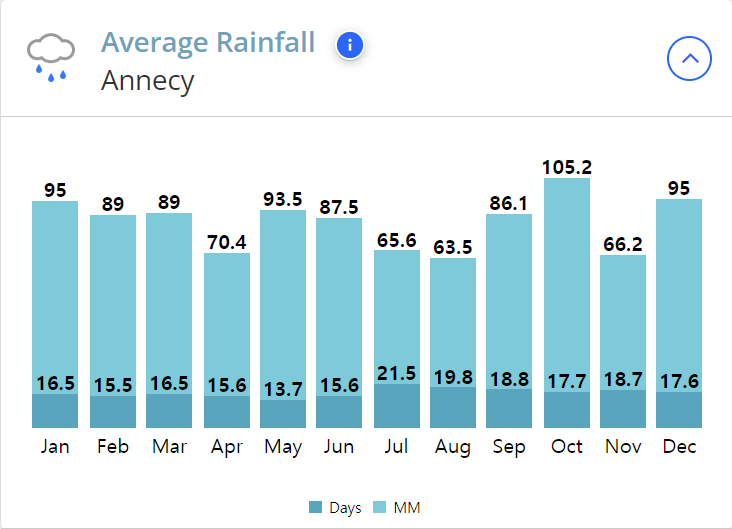 안시의 여름 평균 기온은 21℃이며, 최고 27℃ 수준입니다. 겨울 평균기온은 2℃로 한국의 겨울보다 따뜻합니다.