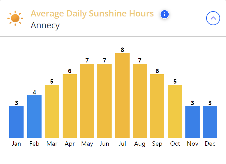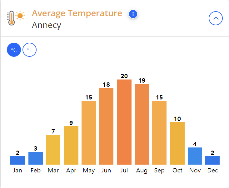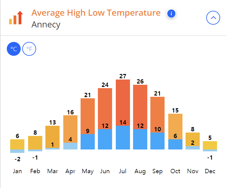 안시의 여름 평균 기온은 21℃이며, 최고 27℃ 수준입니다. 겨울 평균기온은 2℃로 한국의 겨울보다 따뜻합니다.
