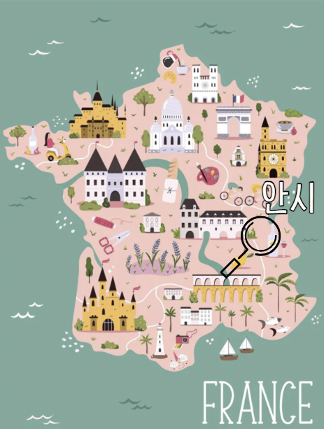 '안시'는 프랑스 남동부 오베르뉴론알프 지방에 위치한 도시로 프랑스 주요 도시에서 기차,버스로 쉽게 이동 가능합니다.
