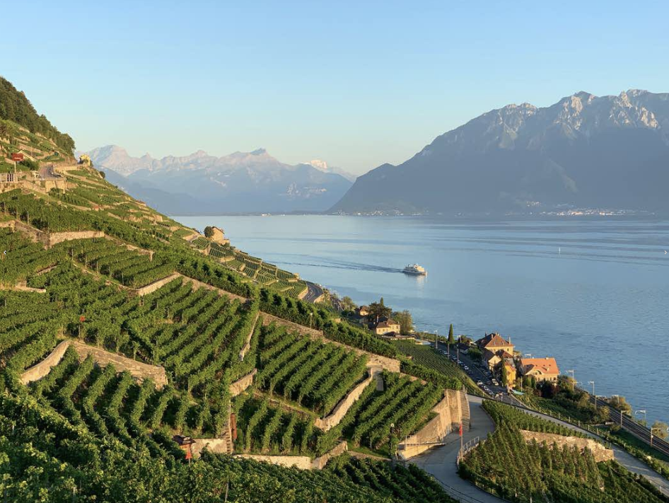 하이킹 중간에 레만 호와 아름다운 라보 와이너리