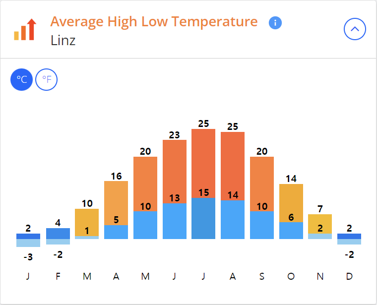 린츠의 연중 날씨는 대체로 대륙성 기후를 나타내며 한국과 동일하게 사계절이 명확하게 구분됩니다.