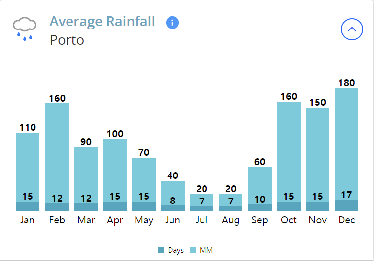 ③ 여행하기 좋은 계절 : 포르투를 여행하기 좋은 계절은 비가 많은 오지 않는 봄, 여름, 가을철이며, 여름에는 온도가 높아 더울 수 있으나 해수욕을 즐길 수 있어 인기 있는 계절입니다.