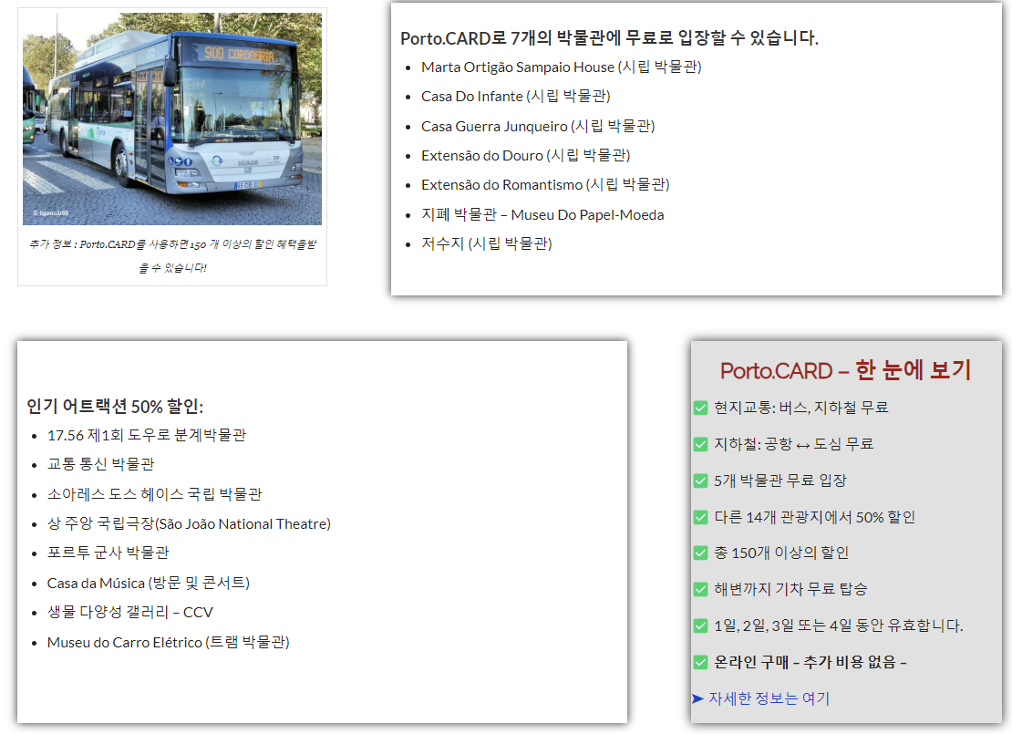 • 혜택 : 포르투 교통 무제한 이용 권 (트램 미포함)  + 관광 명소, 박물관 무료입장 또는 할인권 + 레스토랑, 상점, 자전거 대여소 등 일부 서비스 할인권