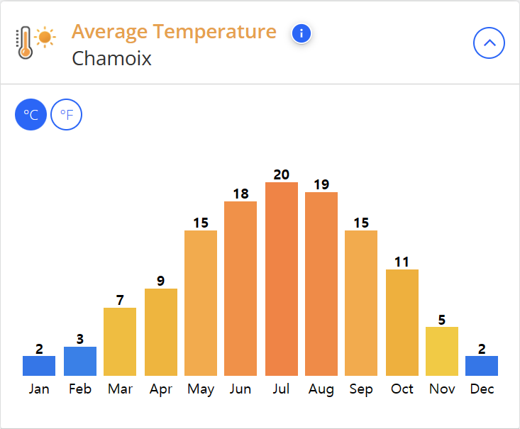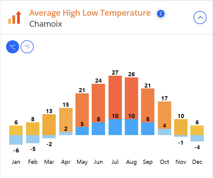 샤모니의 여름은 27℃ 이며, 겨울은 -6℃로 춥습니다.