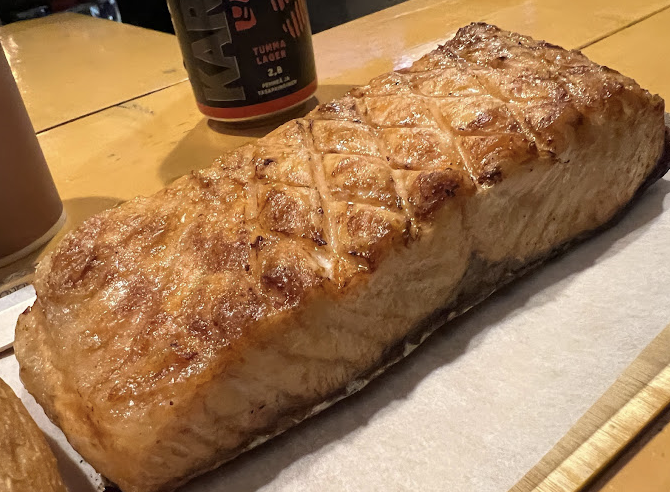 전통적인 천막에서 모닥불로 구운 신선하고 맛있는 연어를 제공하는 레스토랑으로