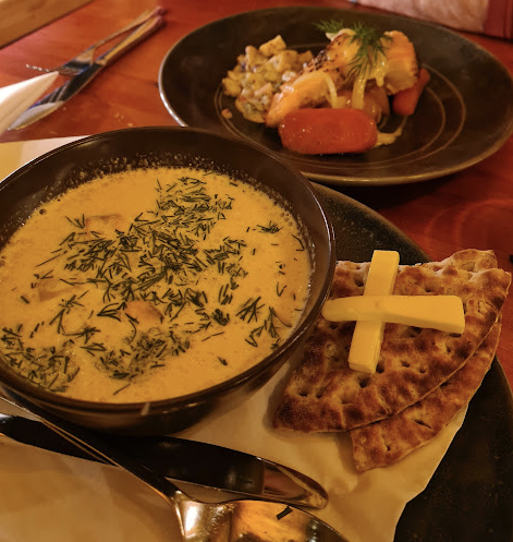 버섯 리조또, 훈제 연어, 대구 튀김, 순록 볶음, 쇠고기 스테이크 등을 드실 수 있습니다.