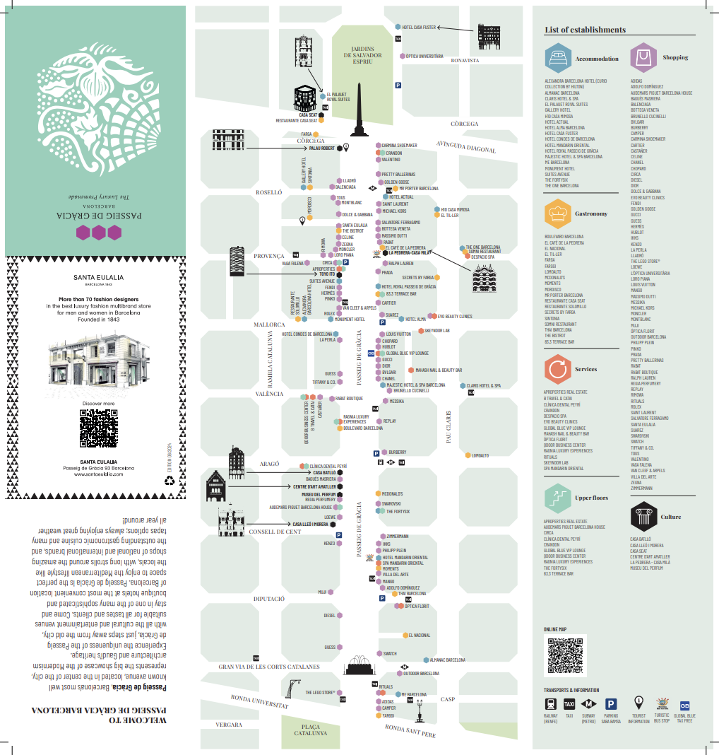 바르셀로나 도시를 대각선으로 가로지르며 약 11km 의 거리로 이어지며, 다양한 고급 부티크 샵과 카페, 레스토랑이 있어 쇼핑을 하고 휴식을 취할 수 있는 곳입니다. Passeig de Garcia를 가르지르는 곳에서 시작하여, Diagonal Mar 꼭대기의 Pedrables 쇼핑몰까지 이어지며, Zara home, BoConcept 과 같은 가구, 인테리어 브랜드 부터 Gucci, Giorgio Armani 와 같은 부티크 숍도 위치 해 있습니다.