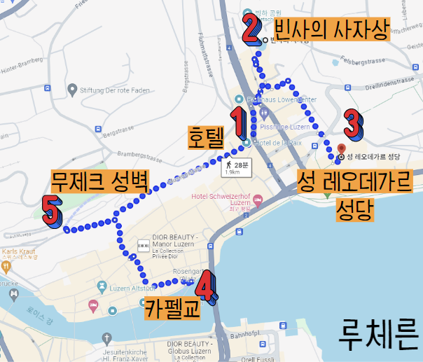 - 루체른 여행 코스 : 카펠교 → 무제크 성벽 → 빈사의 사자상 → 호프 성당