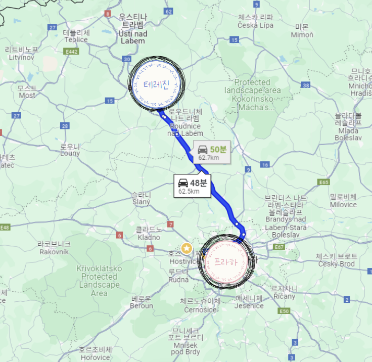 - 프라하 나드라지 홀레쇼비체 정류장 (Nádraží Holešovice) → (Litoměřice 행 직행버스) → Terezin aut.n에 하차
