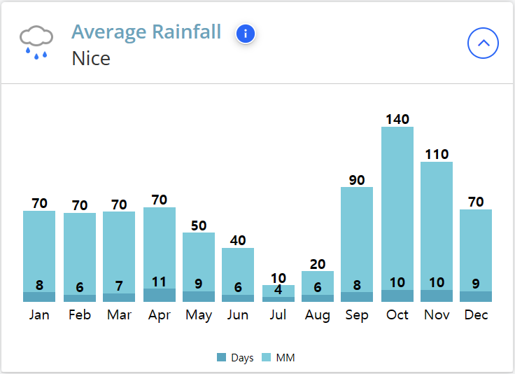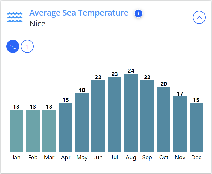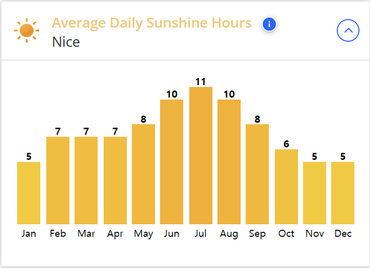 니스는 지중해 해안을 끼고 있어 1년 내내 온화한 기온을 가진 도시이며, 여름에는 27 ℃ 수준으로 해수욕을 즐기기 위한 여행객들이 많은 계절입니다. 니스의 겨울은 영상 13℃ 수준으로 한국의 겨울보다 따뜻한 휴양도시입니다.