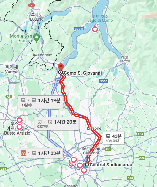 밀라노 중앙역이나, 가리발디 역에서 코모로 가는 열차가 운행하며, 산 조반니역/ Como Lago 역에 하차하시면 됩니다.