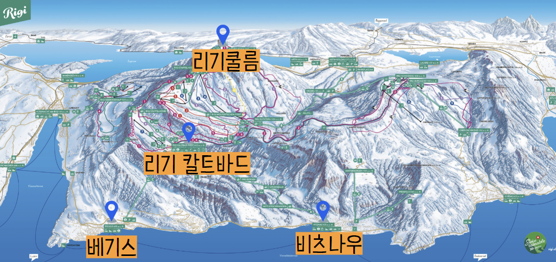비츠나우 (Vitznau) → (산악 열차)→ 리기 쿨름 (Rigi Kulm)→ (하이킹 약 1시간) → 리기 칼드바드 (Rigi Kaltbad) → (산악열차) → 비츠나우 (Vitznau)