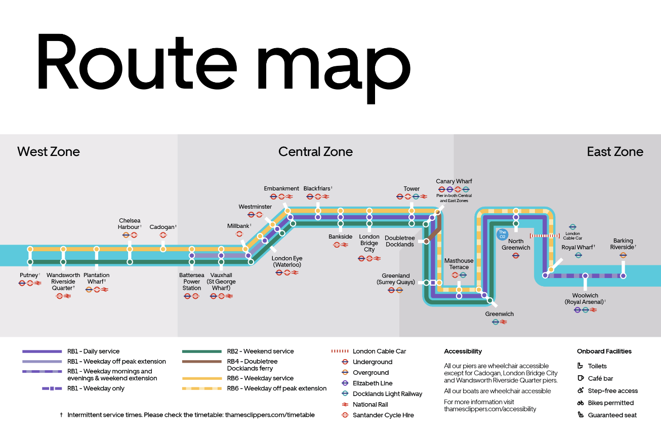 배를 타고 템즈 강을 따라 여행하며, 런던 전역의 24개 부두에 정차합니다.