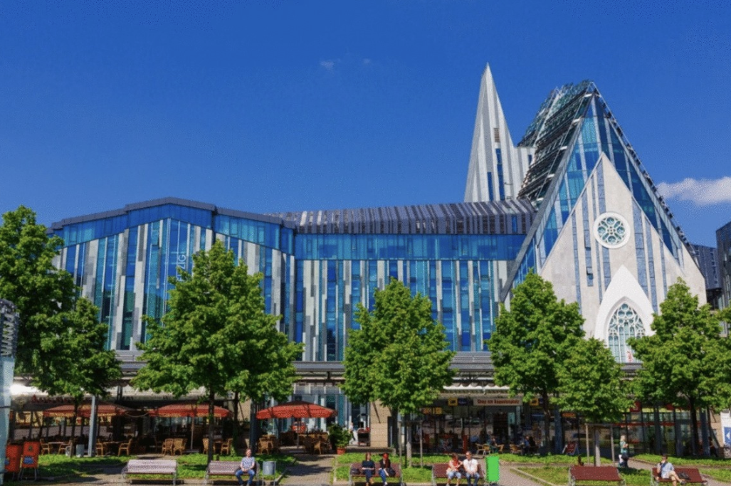 푸른빛 유리 건물의 라이프치히 대학교로 아우구스투스 광장 주변에 위치해 있습니다.