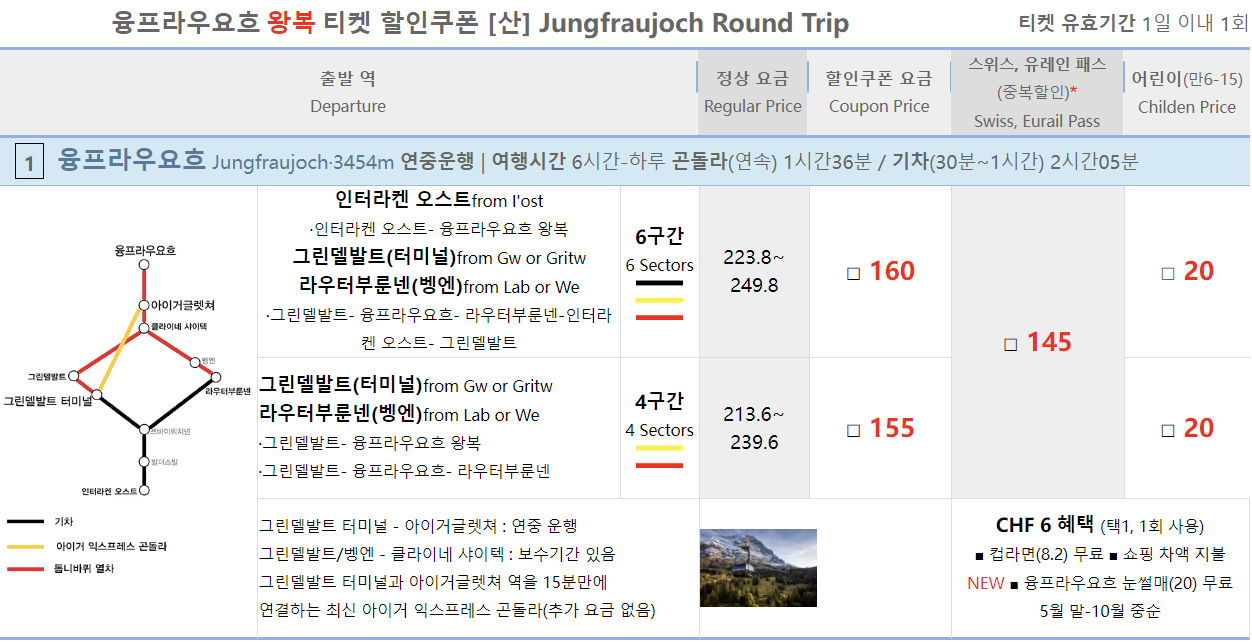 그린델바트 터미널 - 융프라우요흐 왕복 (4구간) : 201CHF (정상 가격) / 155CHF (동신항운 할인) / 반액카드 (100.5CHF)