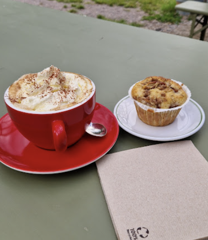 잔디밭에 테이블이 놓여있는 카페로 다양한 종류의 애플파이를 만나실 수 있습니다. 맛있는 커피와 페이스트리를 함께 즐기시는 것을 추천드립니다.