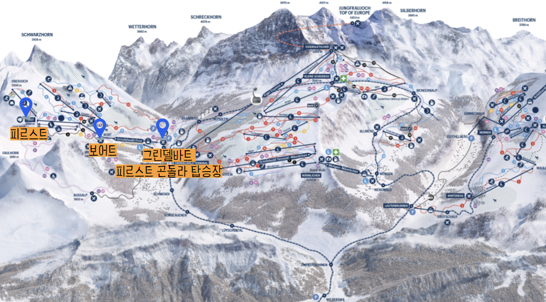 그린델바트 피르스트 곤돌라 → (곤돌라) → 피르스트 (First) → (곤돌라) → 보어트 (Bort) → (트레킹) → 그린델바트