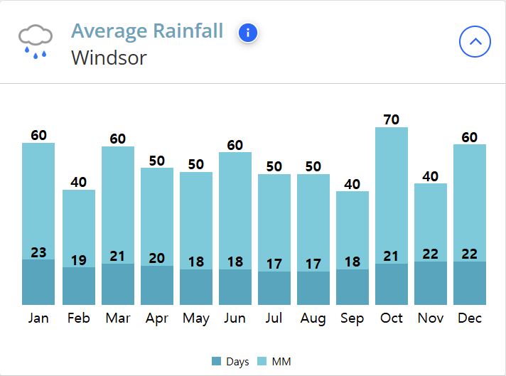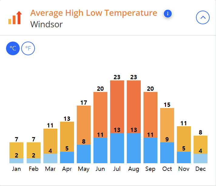 윈저의 연간 기온은 여름철은 23도 겨울철은 4도입니다. 가을과 겨울에 약간 더 많은 비가 내리지만, 일반적으로 연중 고른 강수량을 보이고 있습니다. 윈저는 일반적으로 온화하고 극단적인 기후 변화가 없어 사계절 내내 방문하기 좋은 곳입니다.