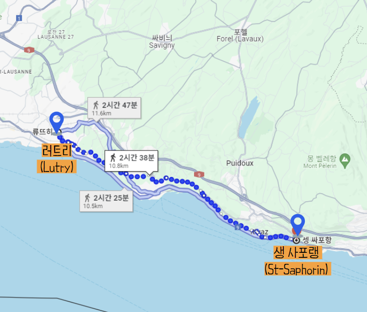생 사포랭 (St-Saphorin) 에서 러트리 (Lutry) 까지 코스로 3시간 소요 코스입니다.