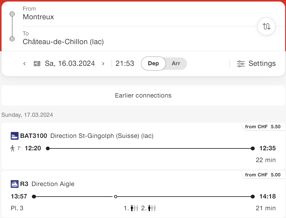 - 출발지 : 몽트뢰(Montreux) → 도착지 : 시옹성(Château-de-Chillon (lac))