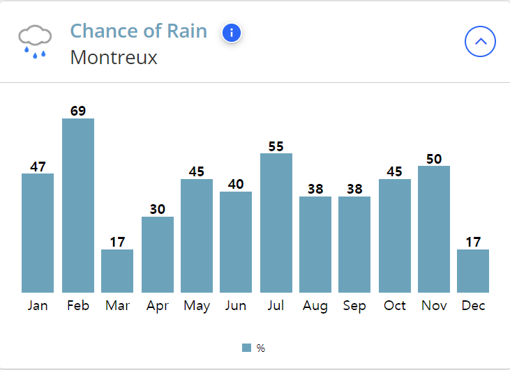 2월은 강수 확률이 69%로 비가 가장 많이 내리는 계절입니다.