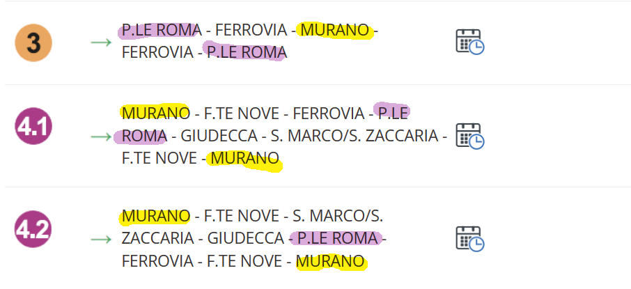 베네치아 본섬(P.LE ROMA) → 무라노 섬(MURANO) : 바포레토로 이동 가능하며, 30분 소요됩니다.